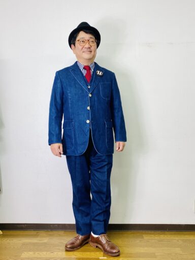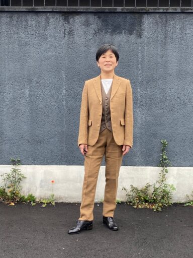 リネンウールの一着。麻と羊毛で織られた生地を、一度水洗いしてスーツに仕立てています。木のボタンを茶色の千鳥格子のベストでコーディネート。ONにもOFFにも使える、シーンを選ばない一着です。